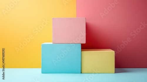 © Benzbutter, Obraz premium Colorful geometric blocks arranged on a vibrant background creating a playful and modern interior design concept