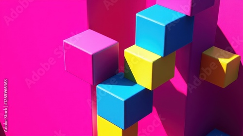 Fototapeta premium Colorful geometric blocks create a playful structure against a vibrant pink...