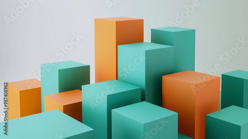 © Arora Chan, Obraz premium Colorful geometric blocks in vibrant turquoise and orange create a dynamic 3D composition, perfect for modern design concepts.