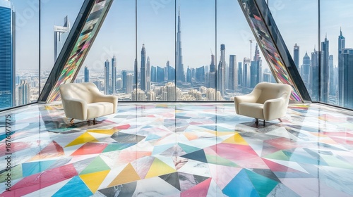 Naklejka premium Colorful geometric patterned floor with modern armchair and panoramic city view.