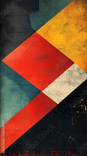 Naklejka premium Colorful geometric shapes overlapping, creating vibrant abstract composition with textured grunge pattern in red, yellow, teal, black hues
