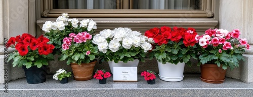 Fototapeta premium Colorful geraniums in flower pots create a vibrant atmosphere on the patio of...