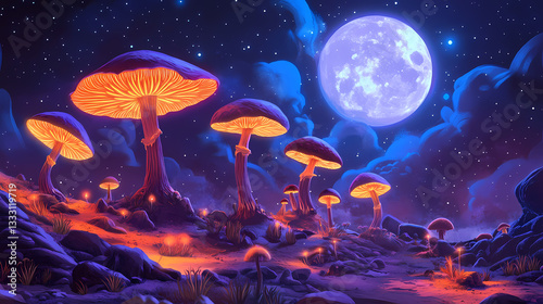 © Thiago, Naklejka premium Colorful giant mushrooms glow under a full moon on a surreal lunar landscape with rocks and small plants at night. Alien Fungi. Illustration