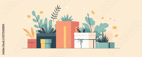Fototapeta premium Colorful gift boxes with plants in a stylish arrangement - vector