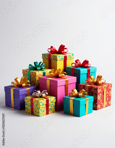 © Юлия Васильева, Obraz premium colorful gift boxes with ribbons on white background. 3d rendering