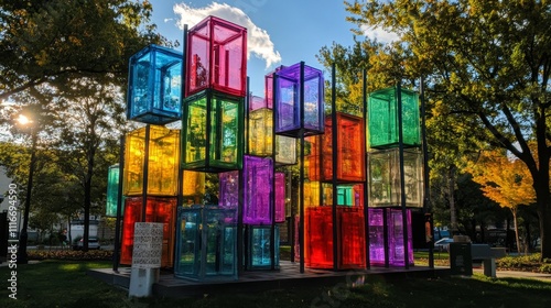 Fototapeta premium Colorful Glass Cube Installation in a Park