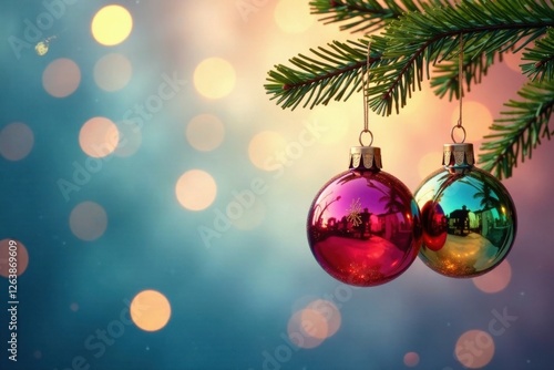 Fototapeta premium Colorful glass ornaments hanging from a branch, ornaments, holiday...