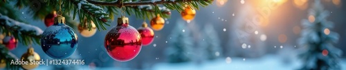 © PHOUVONG , Fototapeta premium Colorful glass ornaments suspended from a Christmas tree branch, winter, glass