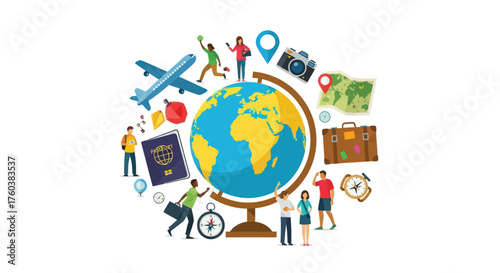 Fototapeta premium Colorful Globe Surrounded by Travel and Adventure Elements.