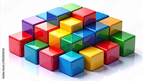Obraz premium Colorful glossy 3D cubes stacked in pyramid formation on white background,...