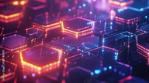 © Business Pics, Obraz premium Colorful glowing neon tech hexagons abstract background. Vector design