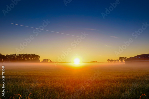 Obraz premium Colorful glowing sunrise over a countryside farming area, creating an idyllic...