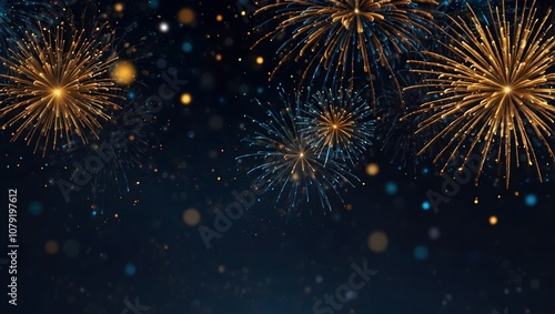 © Laiba, Naklejka premium Colorful gold and blue fireworks explode against a dark night sky, scattered with tiny lights.