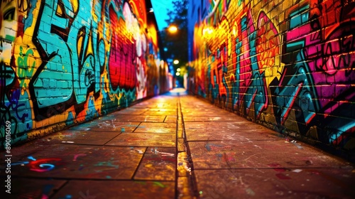 Fototapeta premium Colorful graffiti alley with brick walls covered in vibrant street art.