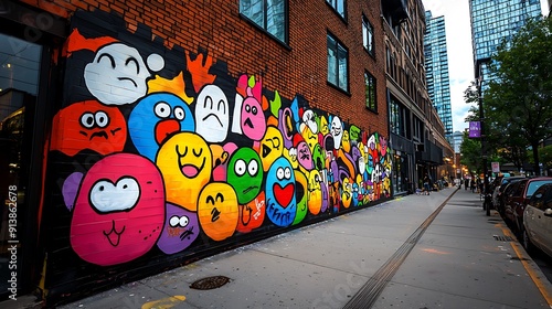 © Raitalinn, Obraz premium Colorful graffiti art explodes on urban wall, a vibrant canvas of children's drawings and cartoon characters