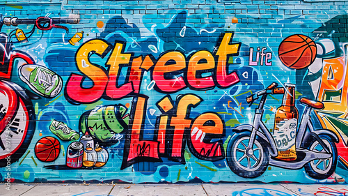 © Paolo, Naklejka premium Colorful graffiti mural depicting street life.