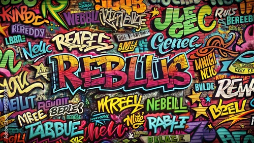 Naklejka premium Colorful graffiti-style words on a wall, urban street art