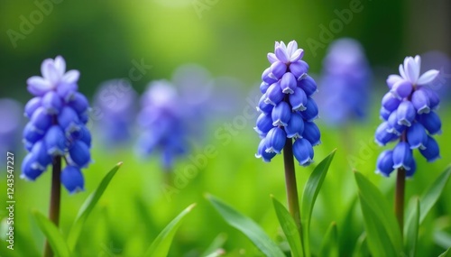 © Chanchai, Fototapeta premium Colorful grape hyacinth flowers blooming on a lush green meadow, , green grass, delicate blue