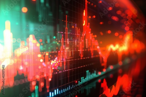 © N Joy Art , Fototapeta premium Colorful graph with red lines and green dots. The graph is abstract and has futuristic feel to it. display of stock market crash chart on computer monitor, colors and lines depicting the sudden drops