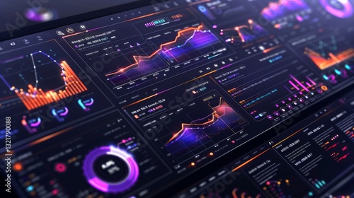 © Prostock-studio, Obraz premium Colorful graphs showcase various data trends and analytics on a sleek digital dashboard, emphasizing data visualization techniques in a technology oriented workspace during night hours.
