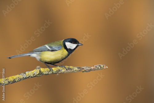 © Marcin Perkowski, Fototapeta premium Colorful great tit ( Parus major ) perched on a tree trunk, photographed in horizontal, amazing background