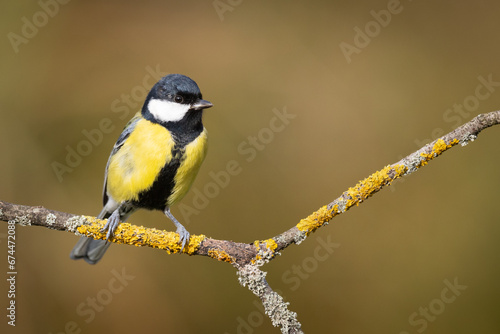 © Marcin Perkowski, Fototapeta premium Colorful great tit ( Parus major ) perched on a tree trunk, photographed in horizontal, amazing background