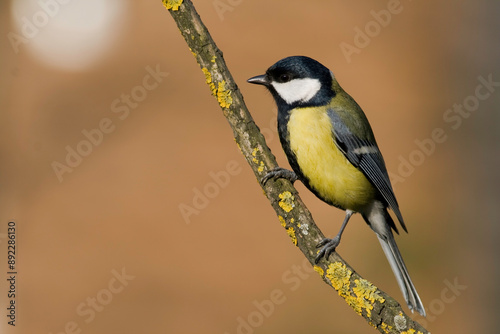 Fototapeta premium Colorful great tit ( Parus major ) perched on a tree trunk, photographed in...