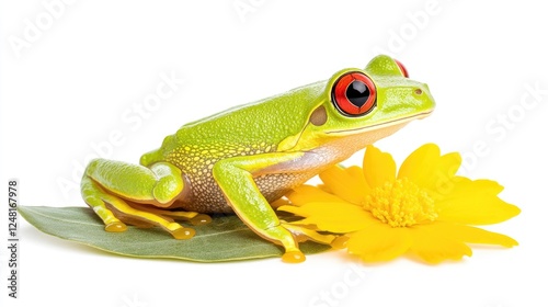 © Sabo, Obraz premium Colorful green tree frog perched on a leaf beside a bright yellow flower against a white backdrop