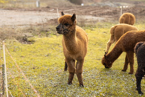 © Lisa Bauer, Fototapeta premium Colorful group of Alpacas on green field