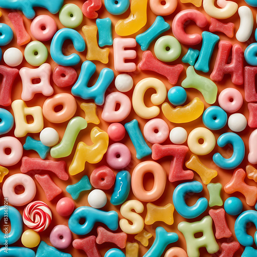 © Iwan, Fototapeta premium Colorful Gummy Alphabet Letters and Candy Shapes on Orange Background
