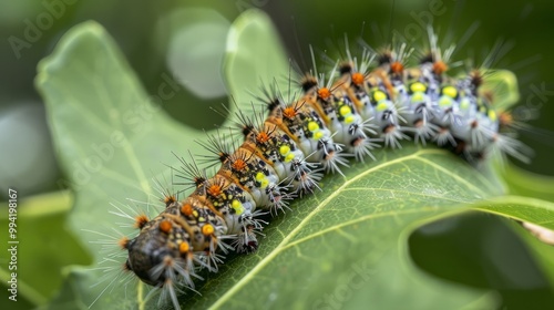 Naklejka premium 4. Colorful Gypsy Moth Caterpillars (Lymantria dispar) on Oak Tree Foliage: Exploring Feeding Habits and Their Effects on Forest Ecosystems