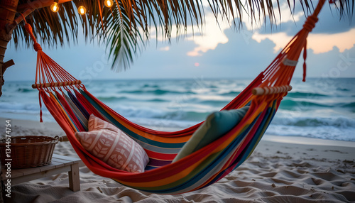 Fototapeta premium Colorful hammock by the beach with ocean view and sunset ambiance