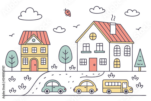 © Manik Mia, Fototapeta premium 46 Colorful hand-drawn city elements, simple doodle buildings, childlike urban sketches, cute houses with varied roofs, cartoon cars and buses, minimalist trees, cheerful town illustrations, primary c