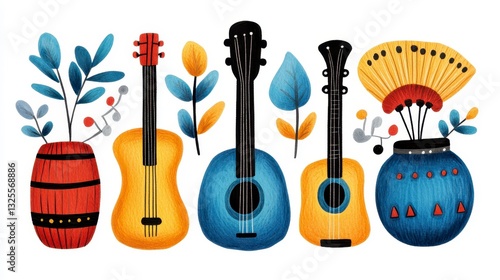 Obraz premium Colorful Hand-Drawn Musical Instruments and Decorative Plants