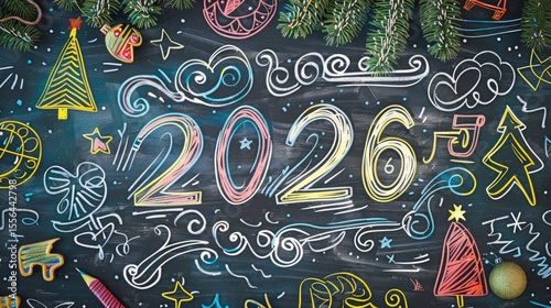 Obraz premium Colorful hand drawn 2026 numbers with decorative doodles on dark chalkboard...