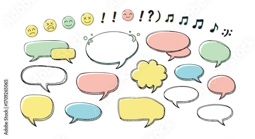 Fototapeta premium Colorful hand-drawn speech bubbles with emojis, perfect for social media marketing and design projects