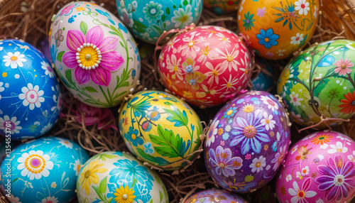 © Jacks Studio, Fototapeta premium Colorful hand-painted Easter eggs in basket