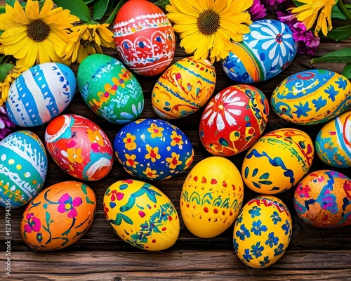 © Biggy, Obraz premium Colorful Hand-Painted Eggs Surrounded by Yellow Flowers and Greens