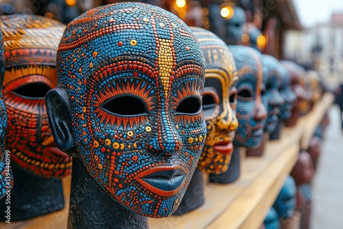 © FlatonArt, Fototapeta premium Colorful Handcrafted African Masks on Display in Outdoor Market