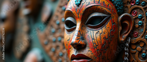 © SlavaOkey, Fototapeta premium Colorful handcrafted mask displayed in cultural exhibition setting