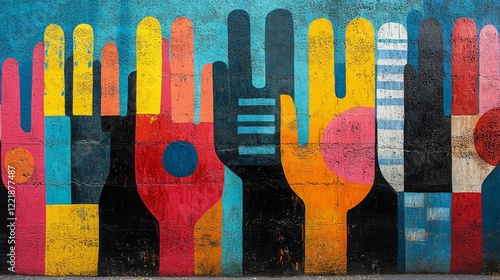 © Ahmad M., Naklejka premium Colorful Hands Mural Symbolizing Unity Diversity and Community Togetherness on Textured Wall Surface