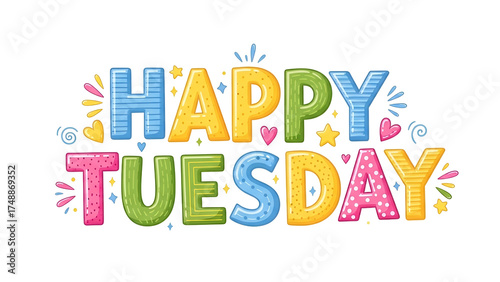 Fototapeta premium Colorful Happy Tuesday Typography with Stars and Hearts on Black