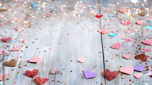 Obraz premium Colorful heart confetti scattered on wooden surface, creating festive atmosphere