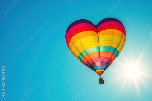 Fototapeta premium Colorful heart shaped hot air balloon flying in a bright blue sky with sun rays