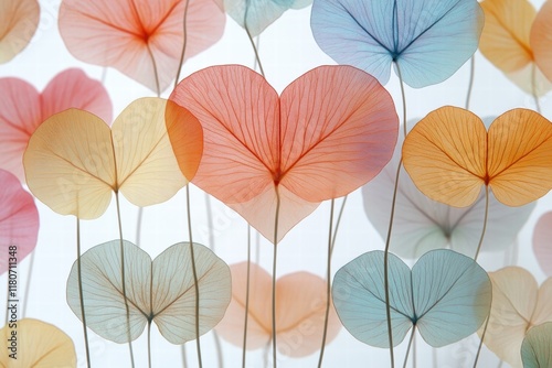 © OnuTH, Obraz premium Colorful Heart-Shaped Leaves with Delicate Veins and Soft Lighting