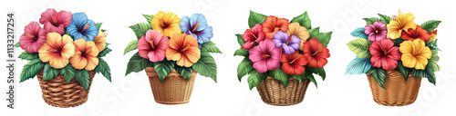 Obraz premium Colorful Hibiscus Flowers in Baskets on Transparent Background