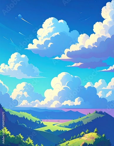© cahaya, Obraz premium Colorful Hills and Fluffy Clouds Landscape Painting.