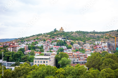 Fototapeta premium Colorful hillside neighborhood in Tbilisi, Georgia, with traditional houses, modern buildings, and a historic church on the hilltop. This scenic view captures the blend of old and new architecture