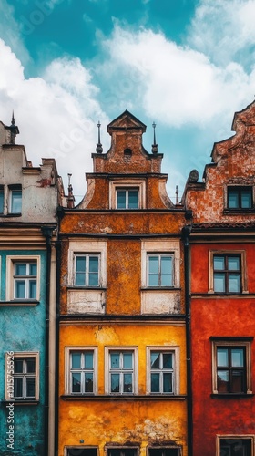 © Dragon42, Fototapeta premium Colorful Historic European Buildings with Ornate Facades Under a Vibrant Blue Sky and Fluffy Clouds