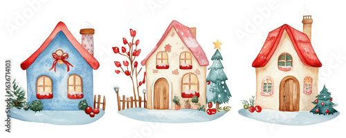 Obraz premium Colorful holiday houses with festive decorations in a winter setting